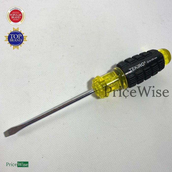 Merk: TekiroTipe: Magnet dengan Gagang KaretUkuran: (-) 6 x 125 mmPanjang Keseluruhan: 234 mmPanjang Mata Obeng: 125 mmBahan: Chrome-Vanadium (CrV), sehingga produk mengkilat, kuat dan tahan karat.Larger and comfortable gripFavorite with mechanics with oily hands / Cocok untuk montir dengan tangan berminyakJIS (Japan Industry Standard)Barang dijamin original Te