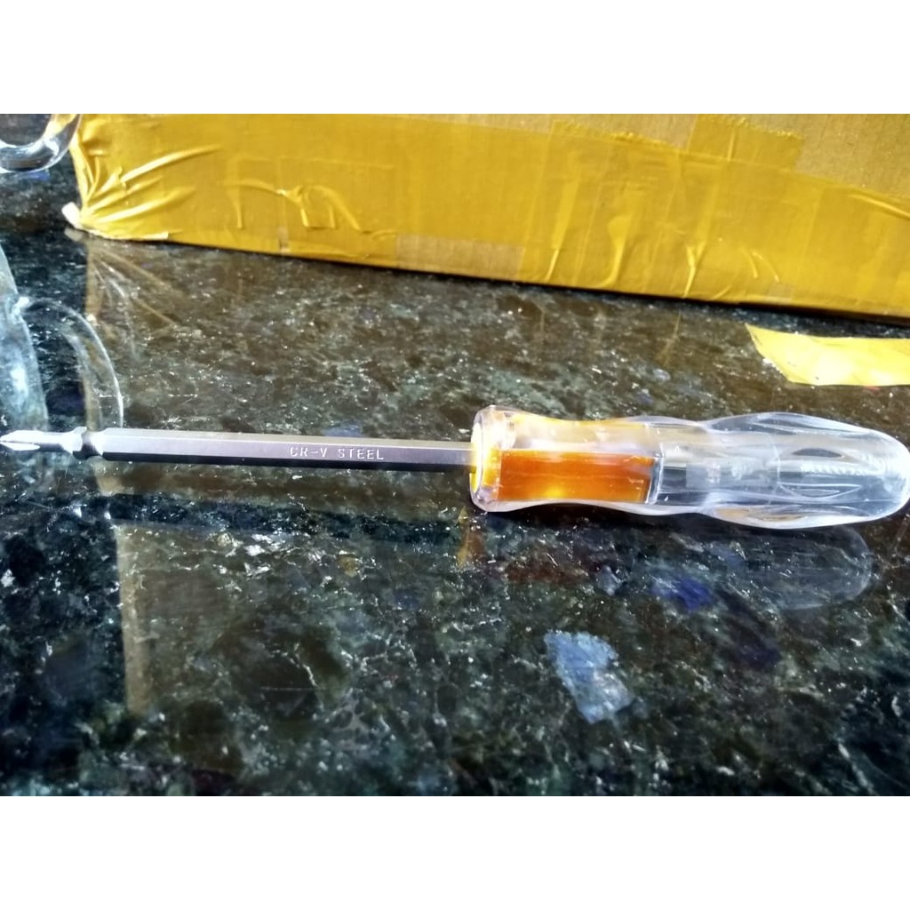 Product name :Obeng Tespen bolak balik / Tes Pen / Test Pen YF813Fungsi Tespen yaitu untuk mengetahui ada tidaknya tegangan listrik pada suatu benda, mesin dan sebuah rangakain listrik ada daya listrik atau tidak, fungsi lainnya yaitu untuk membuka skrub dari komponen alat listrik.Untuk menggunakan testpen pegang gagang test pen.Ujung testpen dimasukkan dalam lubang stop kontak dan jari telunjuk silahkan tempelkan pada pangkal test pen.Jika testpen menyala itu artinya arus positif jika tidak nyala berarti arus negatif.Fungsi Tespen yaitu untuk mengetahui ada tidaknya tegangan listrik pada suatu benda, mesin dan sebuah rangakain listrik ada daya listrik atau tidak, fungsi lainnya yaitu untuk membuka skrub dari komponen alat listrik.Cara Menggunakan :a. Untuk menggunakan testpen pegang gagang test pen.b. Ujung testpen dimasukkan dalam lubang stop kontak dan jari telunjuk silahkan tempelkan pada pangkal test pen.c. Jika testpen menyala itu artinya arus positif jika tidak nyala berarti arus negatif.Cara Membaca Skala dan Hasil :a. Pegang test pen dengan ujung-ujung jari.b. Tempelkan ujung bagian bawah test pen (tempat sumber) dengan penghantar yang akan diuji.c. Setelah itu tempelkan jari ke bagian atas test pen.d. Pada saat LED/bohlam pada test pen menyala, disitulah terdapat aliran arus listrik yang pos