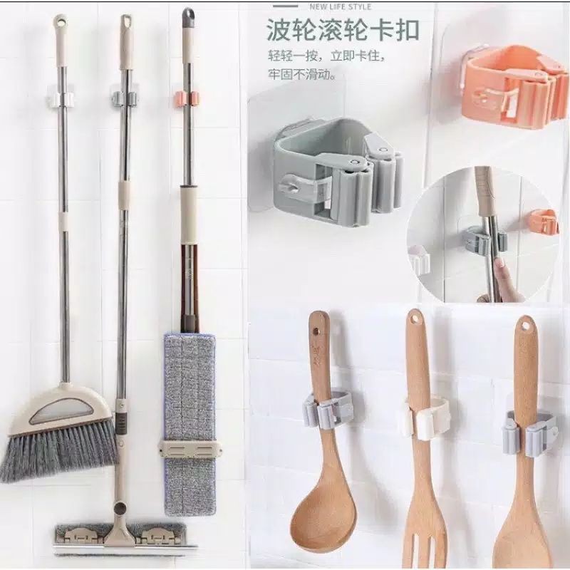 Gantungan / Pengait Gagang Sapu, Pel dan KemocengGantungan atau cantolan untuk gagang sapu / pel dan Kemoceng yang ditempelkan di dinding .Gantungan inovatif ini akan membantu Anda menghemat ruangan sambil merapikan alat-alat pembersih di rumah.Praktis tanpa harus pasang paku, hemat, rapih, bagus dipan