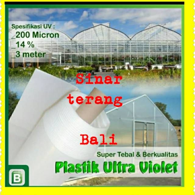 Plastik UV adalah plastik yang dilapisi bahan kimia tertentu yang dapat melindungi dari sinar ultra violet yang berlebihan atau dengan kata lain plastik ini digunakan untuk mencegah tanaman dari kerusakan akibat paparan sinar uv yang berlebihan. Selain kandungan UV protektor plastik UV juga mengandung beberapa zat aditif antara lain IR, AB, EVA dan LD. Semua zat aditif tersebut sangat berguna dalam memaksimalkan fungsi green house. Dilihat dari kandungan UV protektor nya, plastik UV umumnya dibedakan jadi 2 macam, yakni plastik UV 6% dan plastik UV 14%.Makin banyak kandungan UV protektornya makin buram warna plastiknya.Untuk green house mengunakan plastik UV 14% dan untuk penjemuran hasil panen mengunakan plastik UV 6%.Spesifikasi plastik UV :*Lebar plastik 3 meter (Qty=1,kami potong jadi 1meter x 3meter, Qty=2,kami potong 2meter x 3 meter, dan seterusnya. *Ketebalan 200 micron (0.20mm)*14% UV cocok untuk green house hidroponik