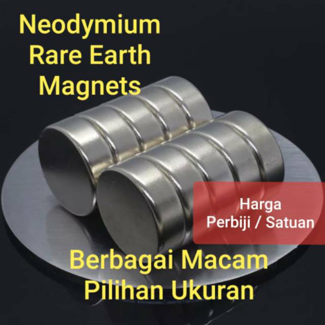 Nb. Harga Untuk 1 biji (Per pcs)Magnet Neodimium Berbagai ukuran Neodymium Strong Rare Earth NdFeB Neodynium Kuat termurah terlaris Magnet Neodymium super strong, magnet paling kuat di dunia Spesifikasi:Material : Nd2Fe14BLapisan : Ni-Cu-NiBentuk : Coin / SilinderDimensi : Variasi sizeAplikasi:Autolock dompet dan tas, mainan magnet, magnet kulkas, accoustic speaker, receiver, microphone, alarm, stage audio, car audio, meteran listrik, meteran air, sensor, cd/dvd player, genset, motor, motor servo, motor micro, MRI scanner, peralatan medis, kuncgi magnetik, pintu jendela magnetik, penghemat bahan bakar, prakarya, membuat kota display sengan magnet, dan masih ada fungsi lai